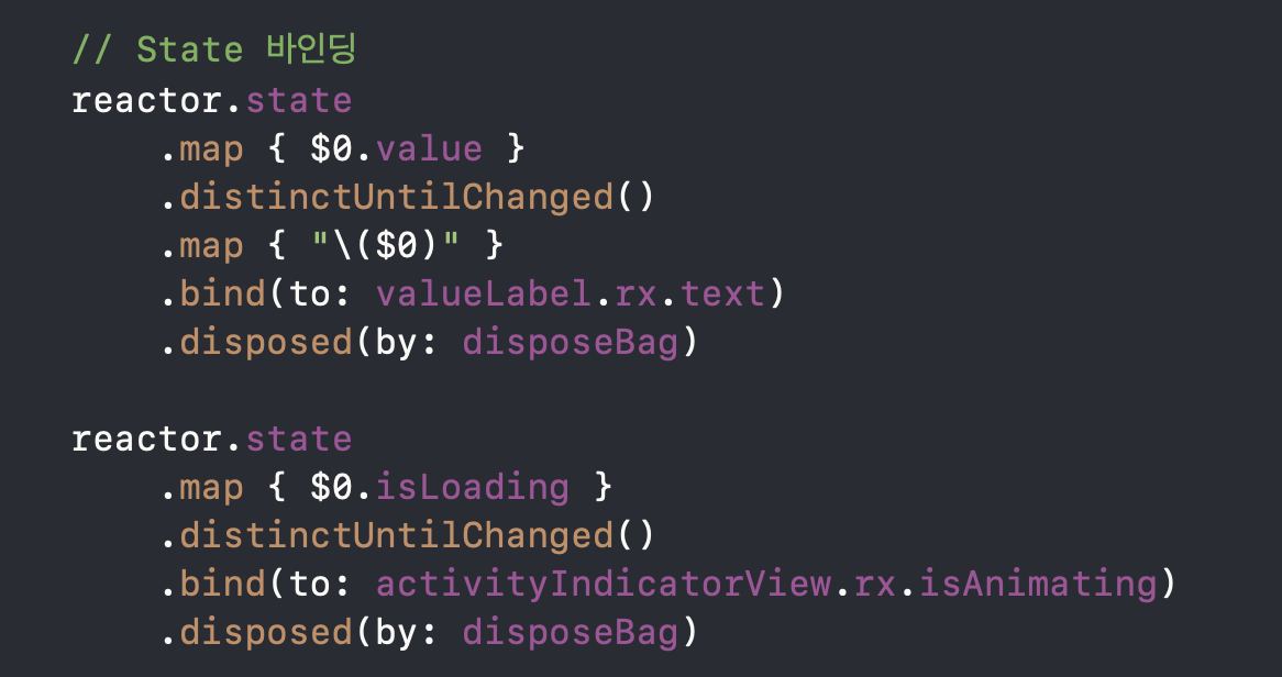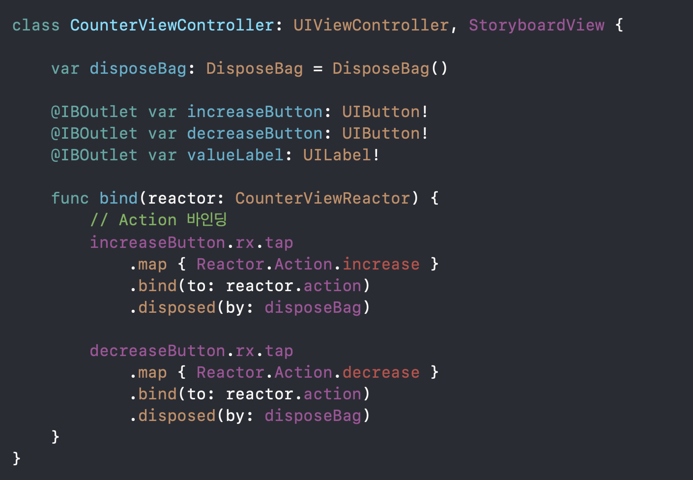 decreaseButton이 탭되면 decrease 액션으로 변환하여 reactor의 action에 바인딩해주겠다
