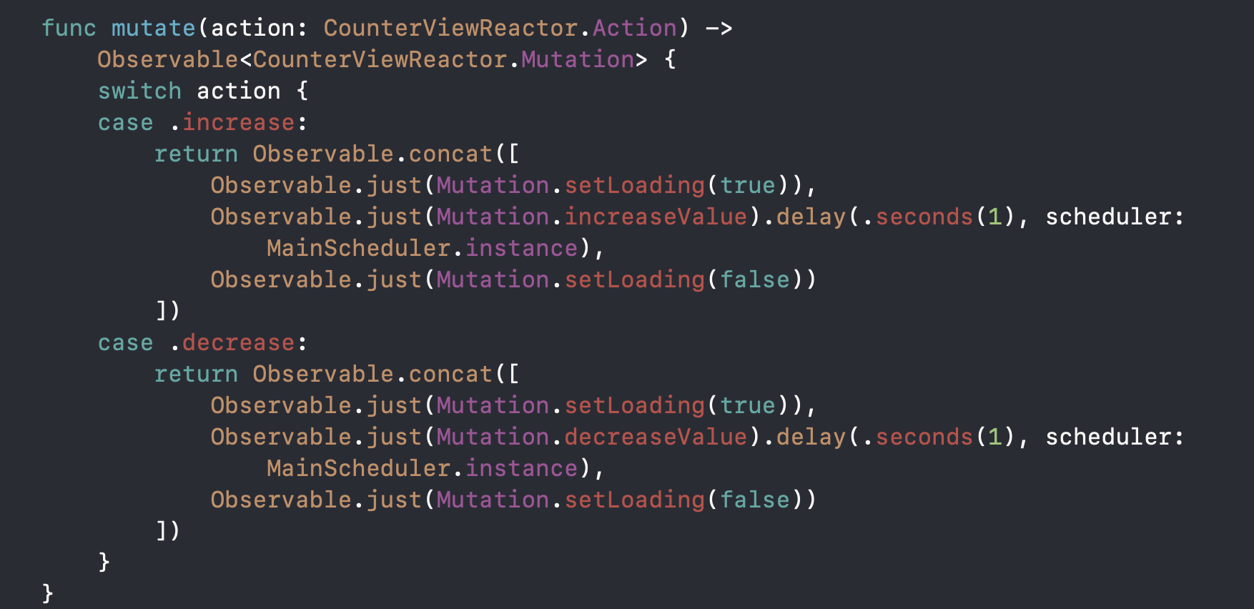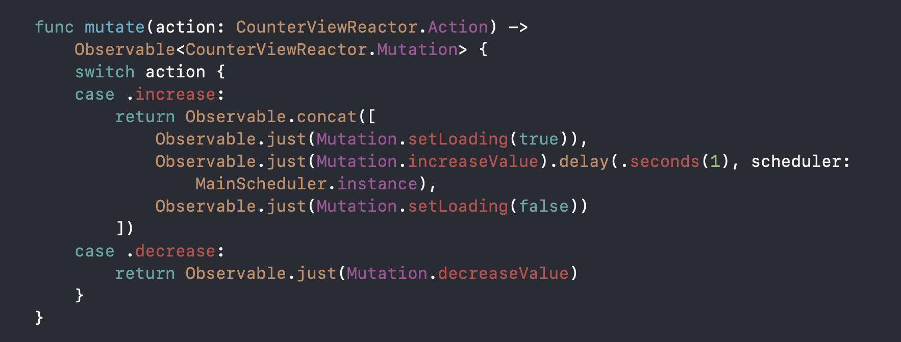 increase라는 action이 들어오면 increaseValue라는 mutation의 Observable을
