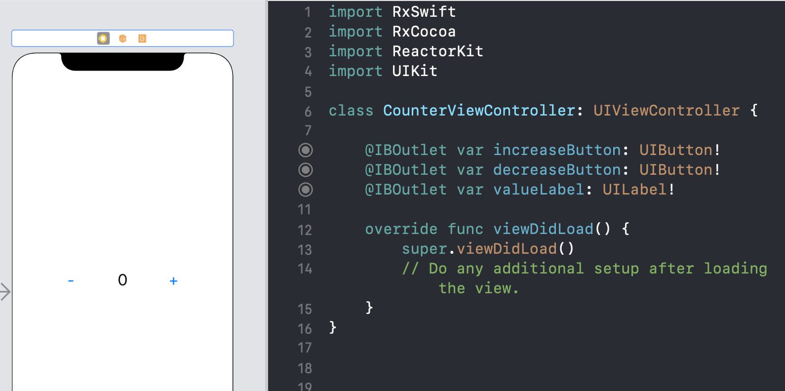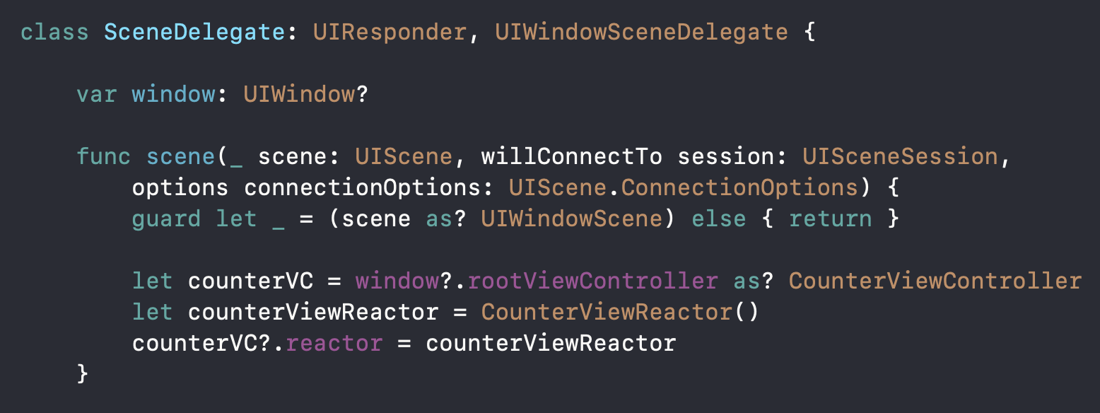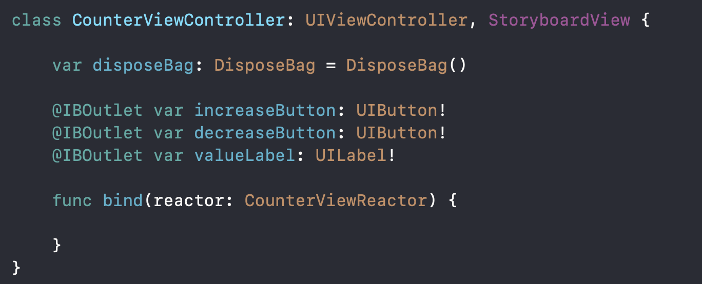 CounterViewController는 ReactorKit에서 'View'에 해당하는 것이고 이 View에 대응되는 Reactor를 만들어줍니다