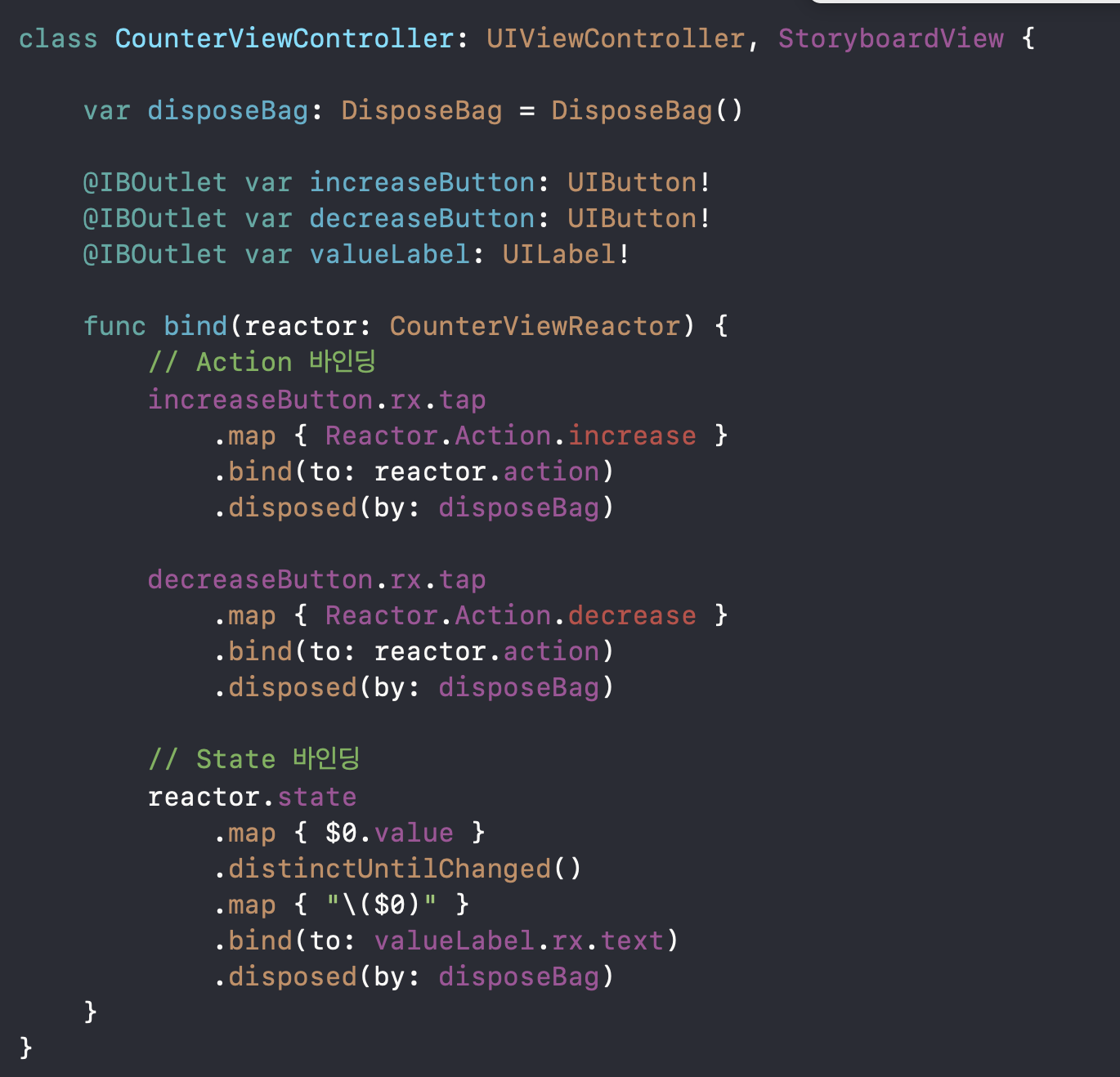 bind라는 함수의 구현해줍니다 (reactor 타입을 아까 만든 CounterViewReactor로 해줍니다)