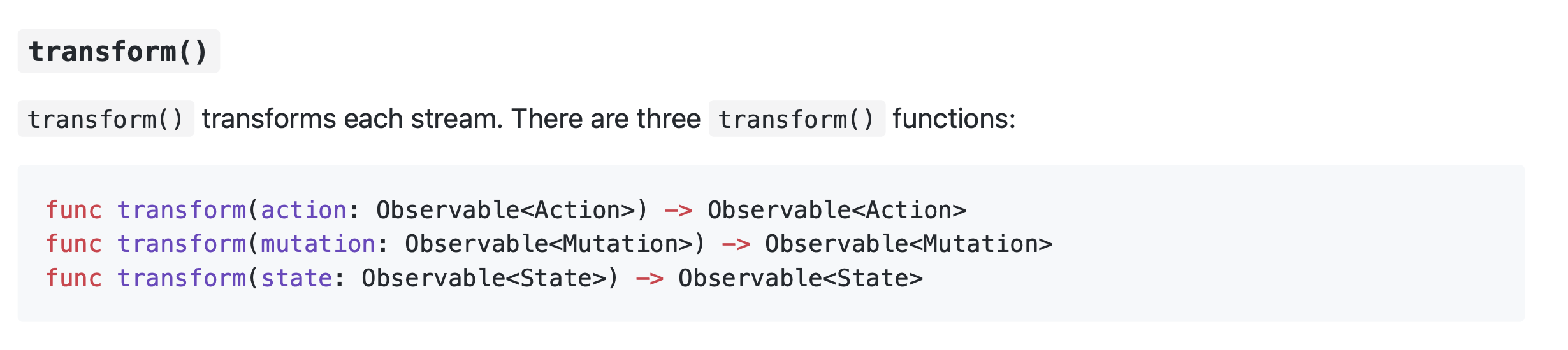 ReactorKit문서 를 보면 transform 함수에 대한 설명이 있습니다.