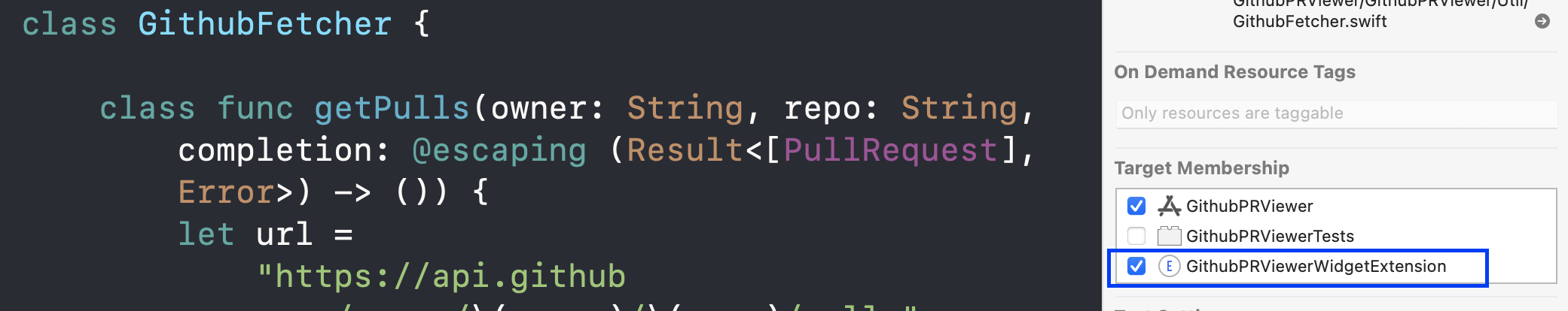 참고로 저는 PullRequest모델 파일이랑 GithubFetcher파일 TargetMembership 설정 해줬습니다-!
