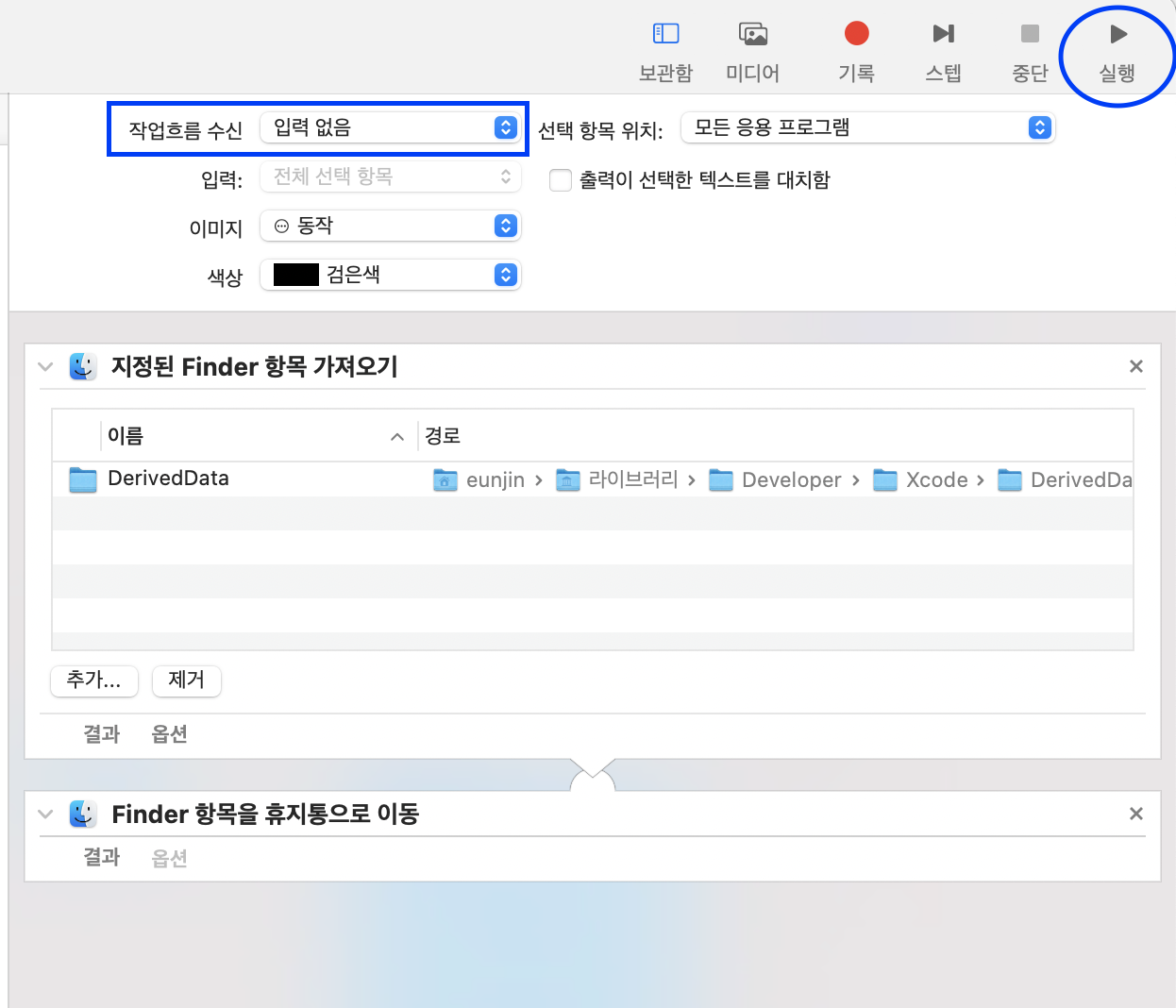 실행을 눌러서 DerivedData 폴더가 휴지통으로 잘 들어가는 지 확인해주세요