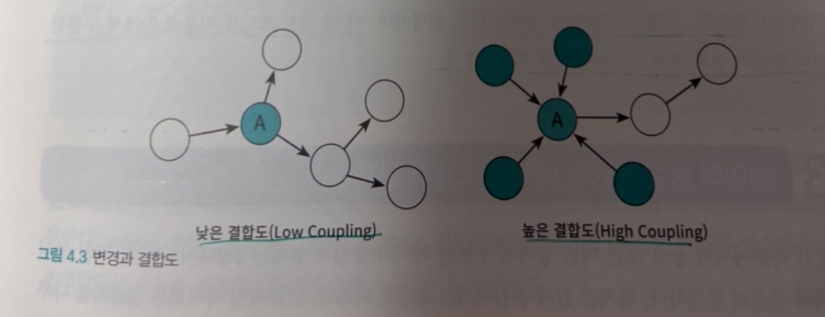 내부 구현을 변경했을 때 이것이 다른 모듈에 영향을 미치는 경우에는 두 모듈 사이의 결합도가 높다고 표현한다.