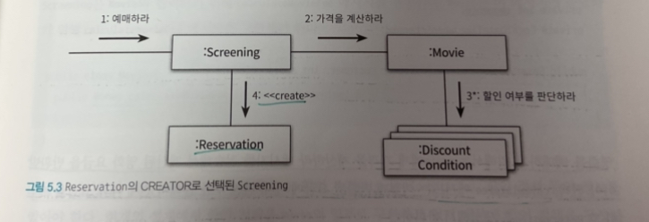 Reservation을 잘알고 있거나 긴밀하게 사용하거나 초기화에 필요한 데이터를 가지고 있는 객체는 Screening이다. Screnning은 예매정보를 생성하는데 필요한 정보 전문가이기때문이다. (영화, 상영시간, 상영순번 알고 있음 / 예매 요금을 계산하는데 필수적인 Movie도 알고 있음)