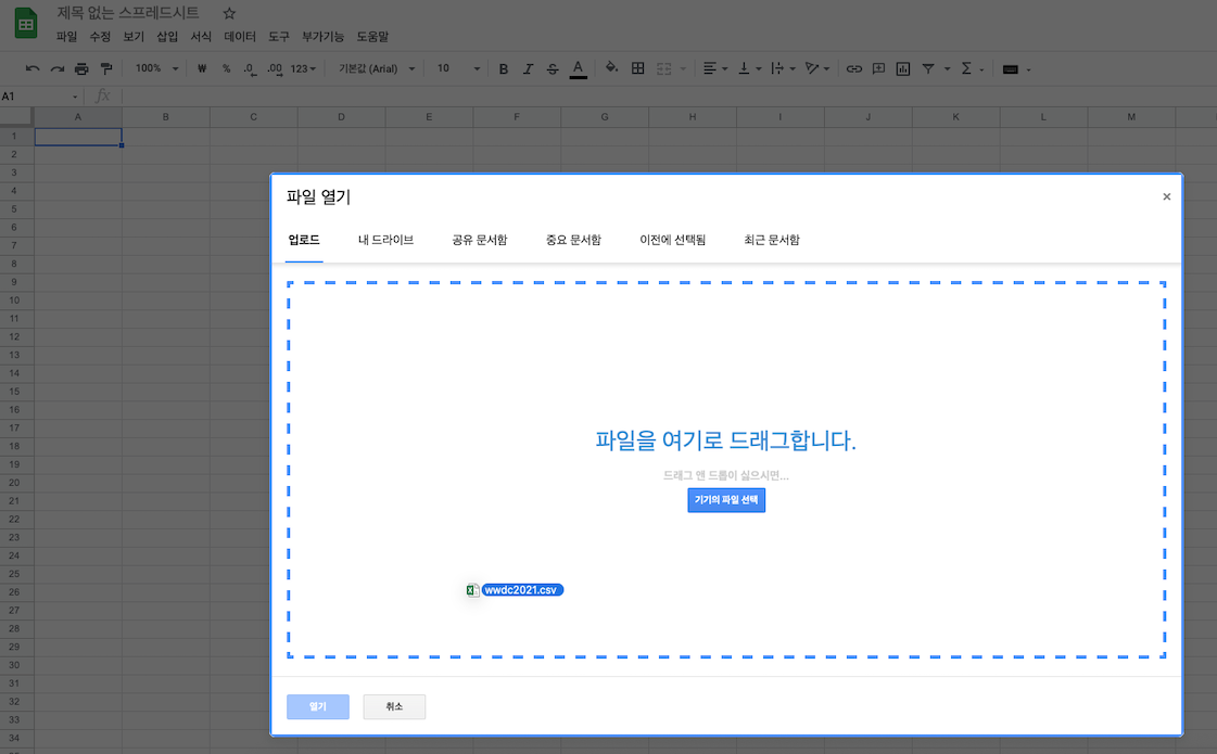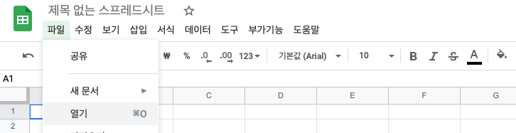 구글 시트 > 새 스프레드 > 파일 > 열기 > 업로드에 csv 파일을 업로드해준다.