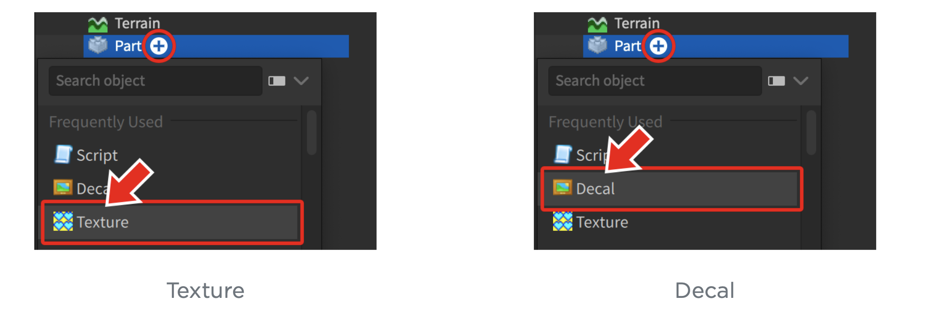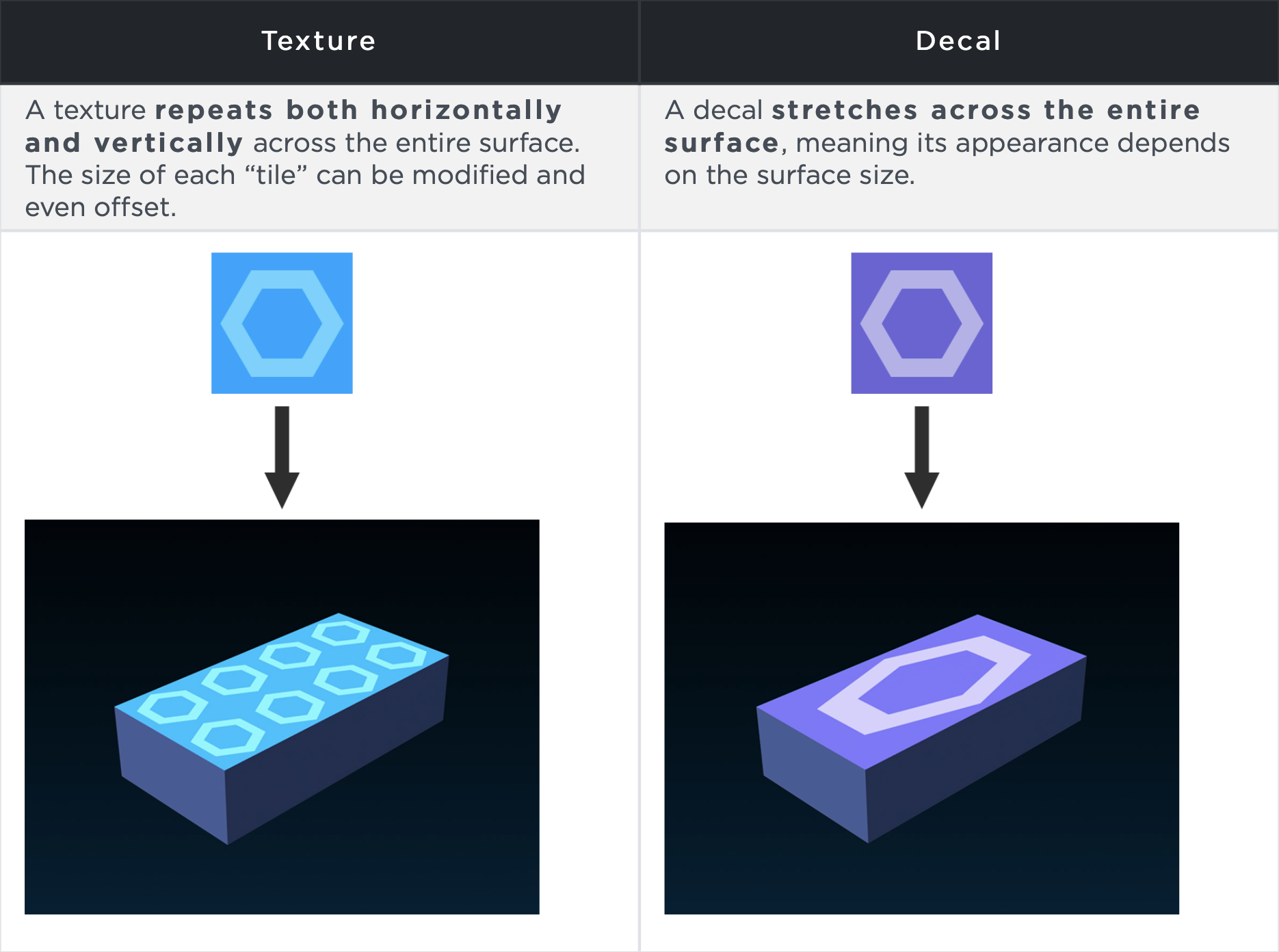 Texture 와 Decal 중 무엇을 사용할 지는 아래를 참고하면 됩니다.