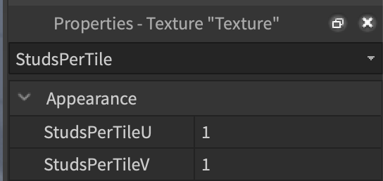 Texture의 경우, 이미지 사이즈는 StudsPerTileU 와 StudsPerTileV 라는 프로퍼티를 통해 컨트롤 됩니다.