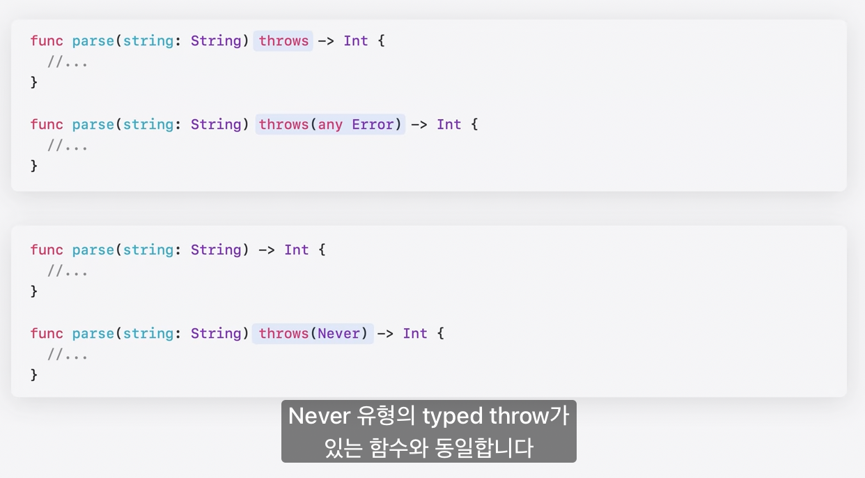 - non-throwing function 은 Never 유형의 typed throw 와 같다.