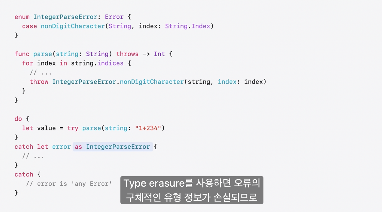 그래서 에러타입을 변경할 수 있는 유연성을 유지하고 싶으면 Untyped throws 를 계속 쓰는 게 좋다.