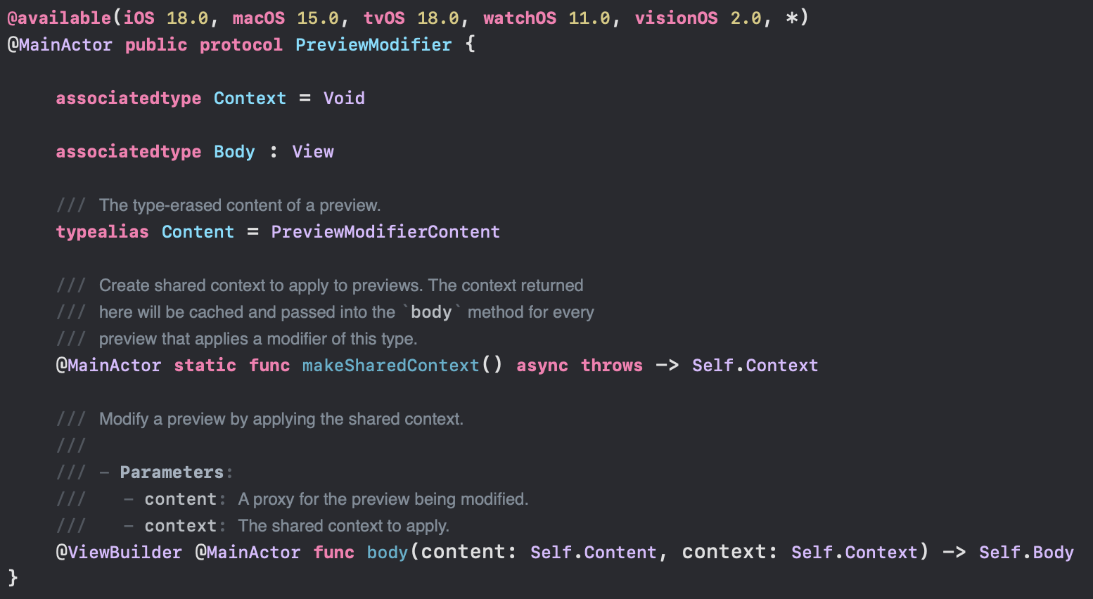- PreviewModifier 은 preview 들끼리 데이터나 환경을 공유할 수 있게 해주는 프로토콜 (iOS 18+)