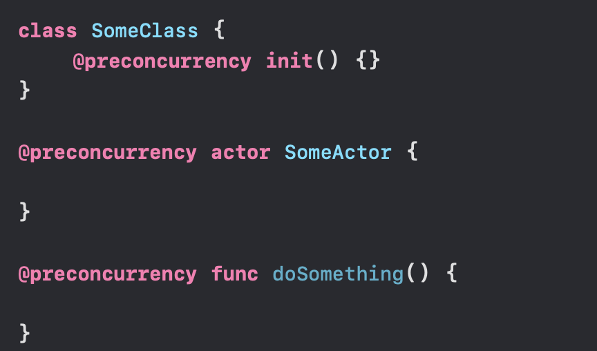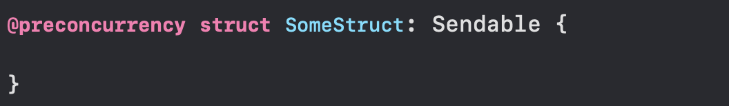 예를 들어, @preconcurrency는 concurrency 시스템이 없던 Swift 5.5 이전에 작성된 코드에서 사용할 수 있으며, 해당 코드가 concurrency 관련 새로운 규칙을 준수하지 않아도 되도록 허용합니다.