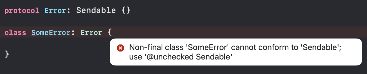 To declare conformance to Sendable without any compiler enforcement, write @unchecked Sendable. You are responsible for the correctness of unchecked sendable types, for example, by protecting all access to its state with a lock or a queue