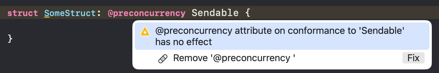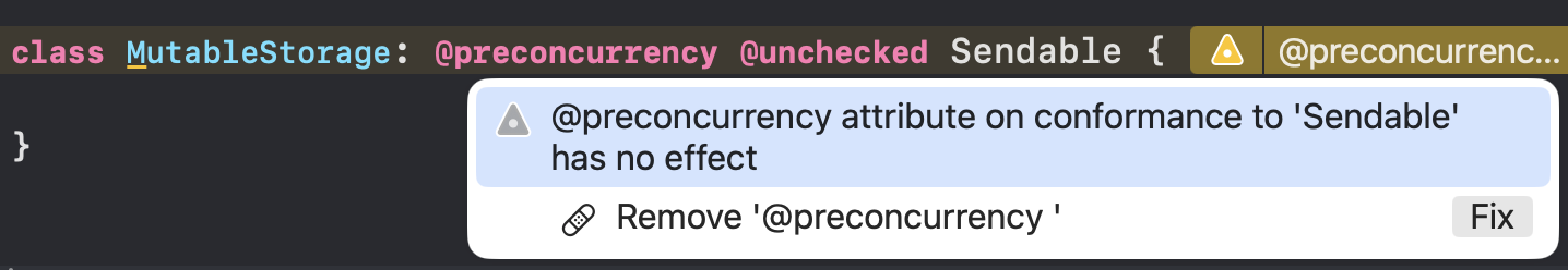 @preconcurrency 를 뒤로 보내면 워닝을 볼 수 있다.
