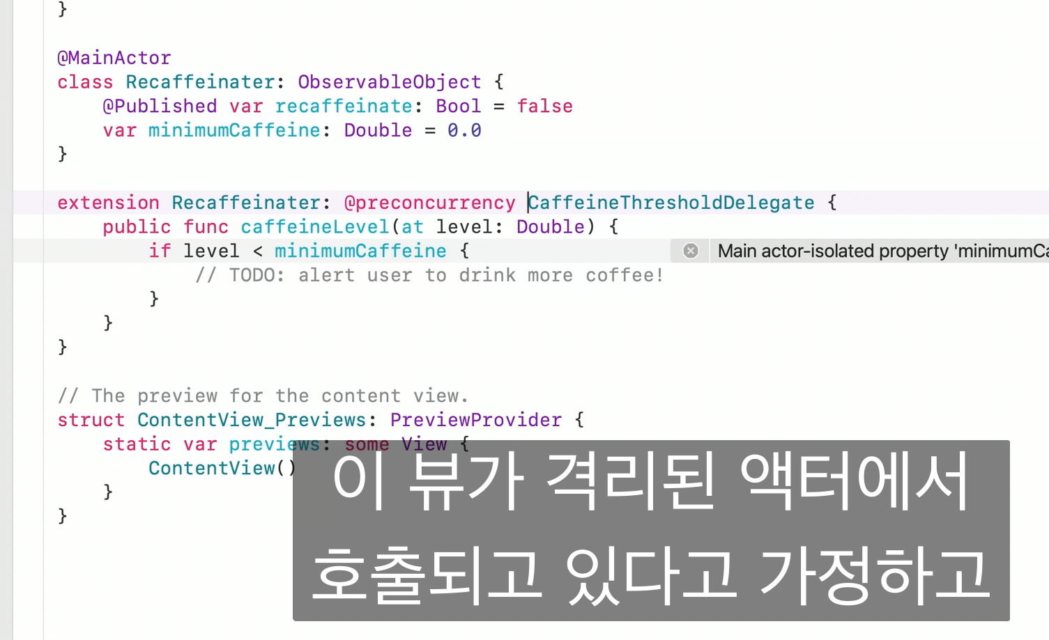 예를들어 아래 예제에서 CaffeineThresholdDelegate 앞에 @preconcurrency 를 붙여서