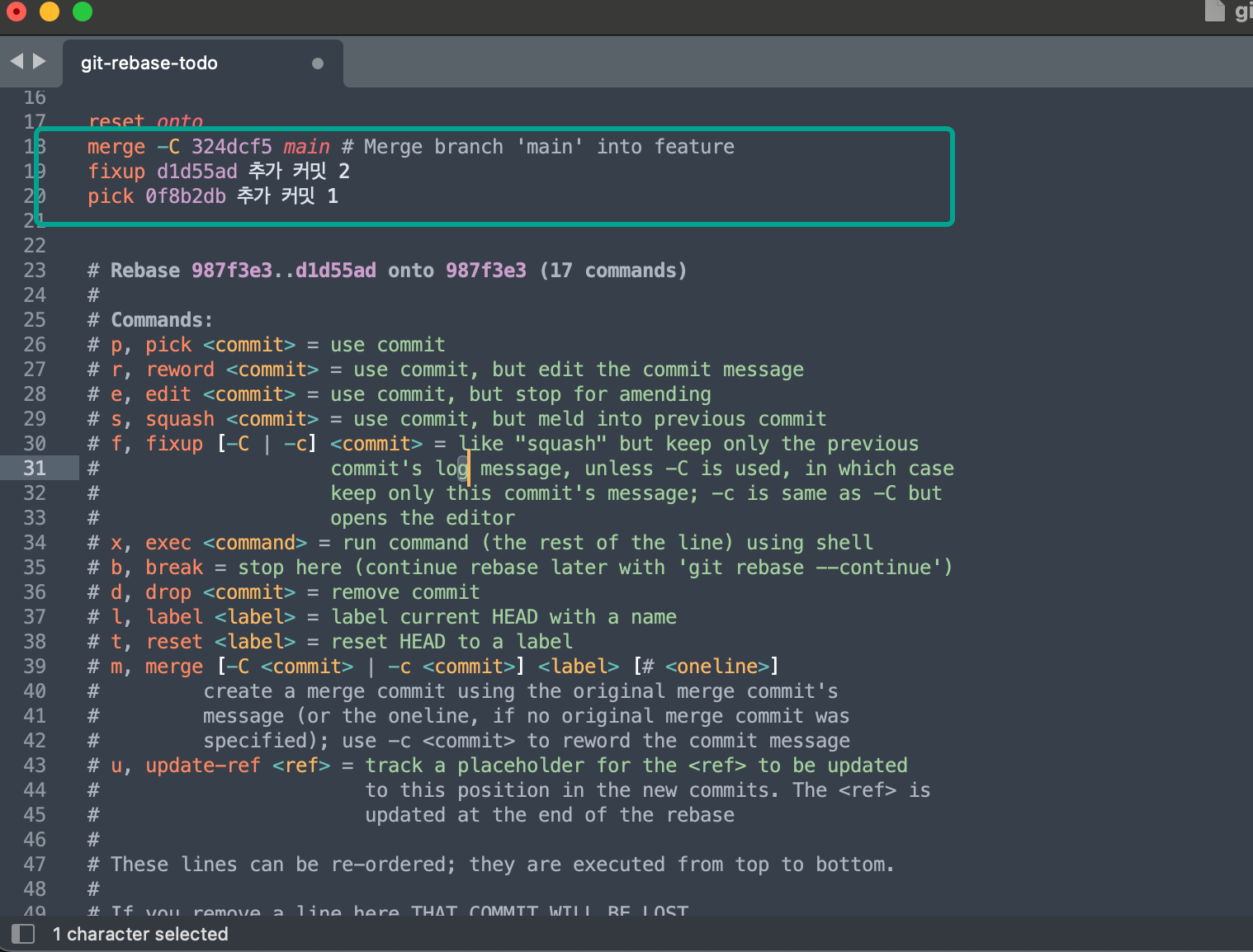 그래서 기본적으로 머지 커밋을 Interactive Rebase (edit, fixup, reword 등) 할 수 없어요.